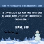 You, our supporters, made a huge difference for those who traditionally find Christmas to be a very lonely time. You have raised over £8,500 which meant that we could raise the spirits of more than 450 individuals by providing them with a festive hot meal or gift, creating positive memories that help them realise that homelessness doesn’t have to be their past, present and future.